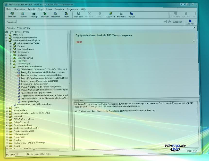 Mit diesem Eintrag können Sie PopUp-Animationen durch die Shift-Taste verlangsamen. Wenn ein Fenster minimiert/maximiert und Sie danach sofort die SHIFT-Taste drücken und gedrückt halten, dann läuft die Animation langsamer ab.