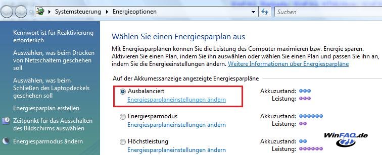 Wählen Sie aus der "Systemsteuerung" den Eintrag "Energieoptionen". Hier sehen Sie jetzt die möglichen Energiesparpläne, wählen Sie hier beim aktiven Energiesparplan den Eintrag "Energiesparplaneinstellungen ändern" (Info: Dieses Einstellung müssen Sie für jeden Energiesparplan vornehmen den Sie verwenden möchten).