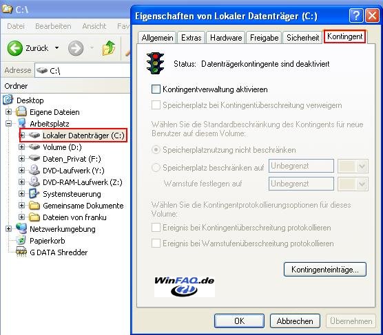 Die Datenträgerkontingentverwaltung finden Sie im Explorer, indem Sie auf einem NTFS-Laufwerk im Kontextmenü (rechte Maustaste auf das Laufwerk) 'Eigenschaften' auswählen. Hier gibt es bei allen - mit NTFS-formatierten Laufwerken - einen Tabreiter "Kontingent".