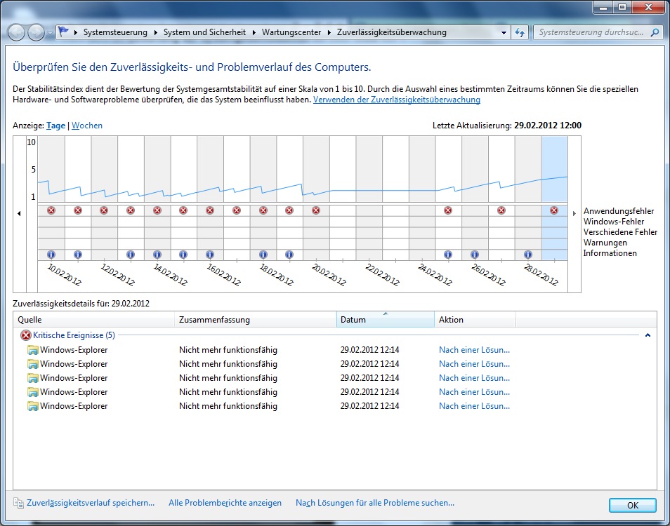 Ab Windows 7 gibt es eine neuen Funktion die "Zuverlässigkeits-Überwachung". Windows prüft wie zuverlässig das System läuft und protokolliert alle wichtigen Ereignisse mit. Aus diesen Ereignissen wird ein Stabilitätsindex berechnet, der in einer Skala von 1 bis 10 liegt.