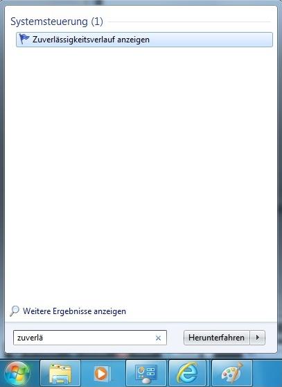 Die Zuverlässigkeits-Überwachung kann durch die Eingabe "Zuverlässigkeit" im Suchfeld einfach aufgerufen werden. In der Ergebnisliste wird der Eintrag "Zuverlässigkeits-Verlauf anzeigen" eingeblendet, den man jetzt nur anklicken muss.