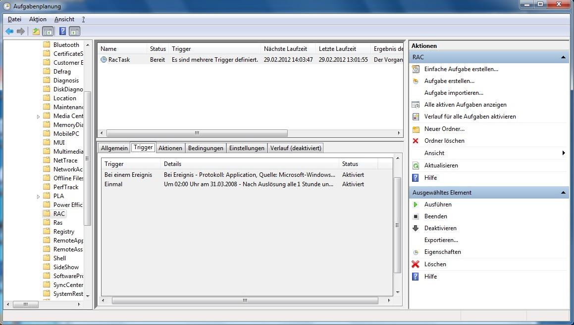Gehen Sie dazu auf der linken Seite in das Menü "Aufgabenplanung (Lokal)" -> "Aufgabenplanungsbibliothek" -> "Microsoft" -> "Windows" -> "RAC". Hier finden Sie jetzt den notwendigen Eintrag "RacTask". Über den Tabreiter "Trigger" können Sie nun nachschauen, ob das Ereignis entsprechend gestartet wird.